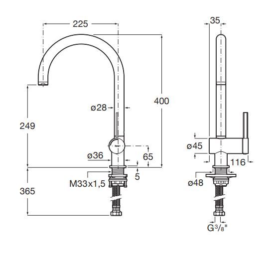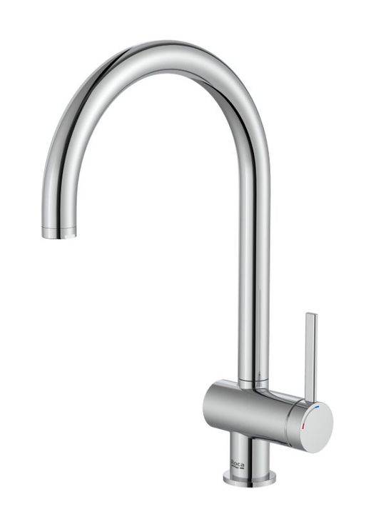 Mezclador monomando Ona para cocina con caño curvo giratorio y enlaces de alimentación flexibles. Acabado cromado. Cold Start. Evershine. La colección Ona destaca por su simplicidad natural, su funcionalidad y su estética marcada en línea con el entorno natural.