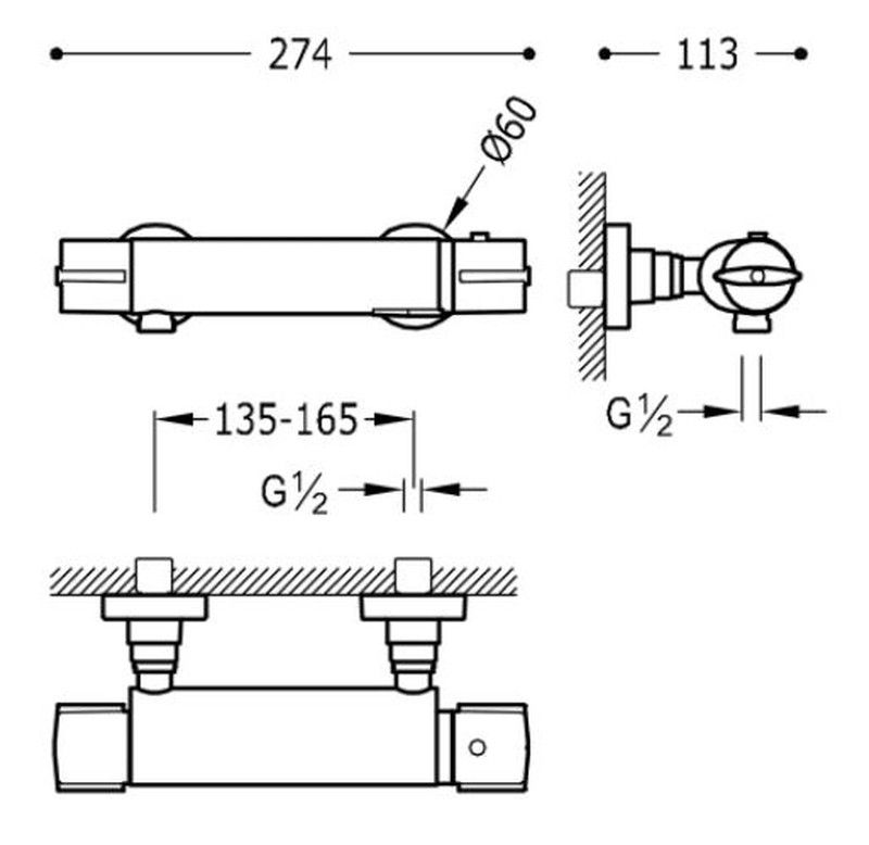 Grifo termostático de ducha para instalación en pared FLAT-TRES. Ref. 20419601. Acabado cromo. Fácil limpieza del cartucho termostático sin perder la calibración de la temperatura.